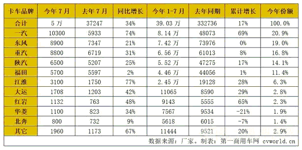 今年1-7月,國內(nèi)重卡市場共計銷售39.03萬輛,比去年同期的33.27萬輛增長17%,凈增量達到5.76萬輛,累計增幅進一步擴大(1-6月的累計增幅是15.16%)。但市場競爭格局相比上半年,基本沒有變化。