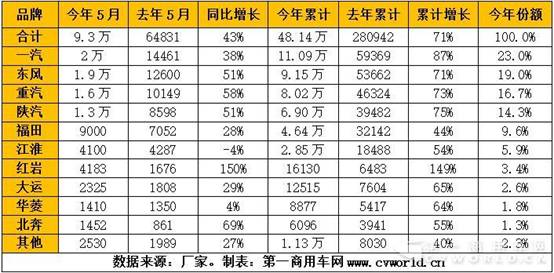 5月份重卡市場(chǎng)排行榜,雖然大多數(shù)企業(yè)銷量環(huán)比均有所下降,但同比依然高漲。