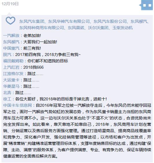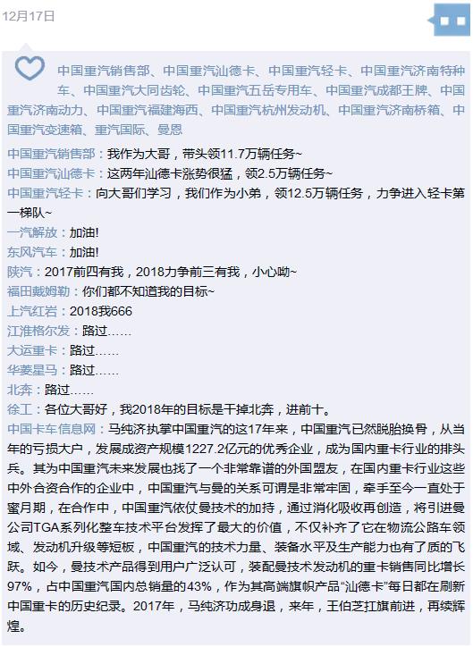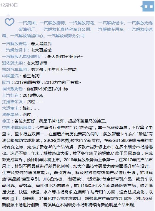 對(duì)于來(lái)年市場(chǎng)大多都是看好的,謹(jǐn)慎點(diǎn)的企業(yè)預(yù)測(cè)80-90萬(wàn)輛,樂(lè)觀點(diǎn)的企業(yè)認(rèn)為可能在90—100萬(wàn)輛。 在此基礎(chǔ)上,各大重卡企業(yè)紛紛曬出了2018年目標(biāo),如果他們都發(fā)朋友圈會(huì)是怎樣?