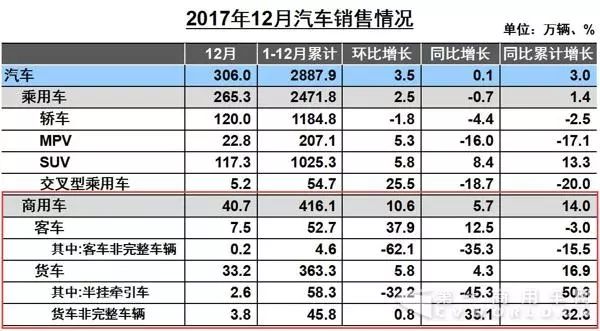 2017年12月商用車產(chǎn)銷數(shù)據(jù)出爐!2018年1月11日,中汽協(xié)發(fā)布2017年12月汽車產(chǎn)銷數(shù)據(jù)。2017年12月,汽車生產(chǎn)304.14萬輛,環(huán)比下降1.26%,同比下降0.70%;銷售306.03萬輛,環(huán)比增長3.47%,同比增長0.10%。其中,商用車生產(chǎn)43.18萬輛,環(huán)比增長5%,同比增長3.11%;銷售40.70萬輛,環(huán)比增長10.56%,同比增長5.70%。