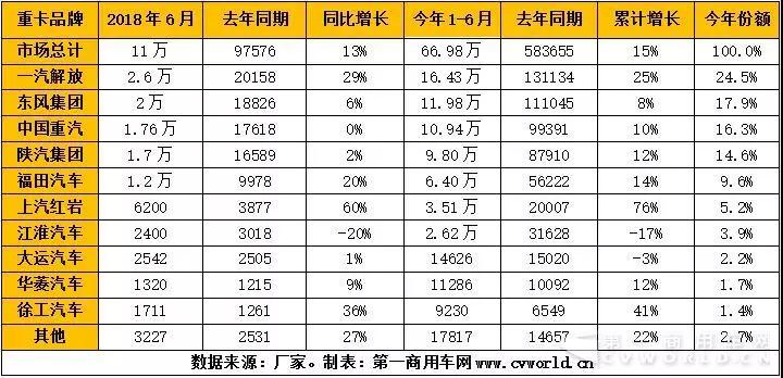 2018年上半年重卡市場企業(yè)銷量一覽表(單位:輛)