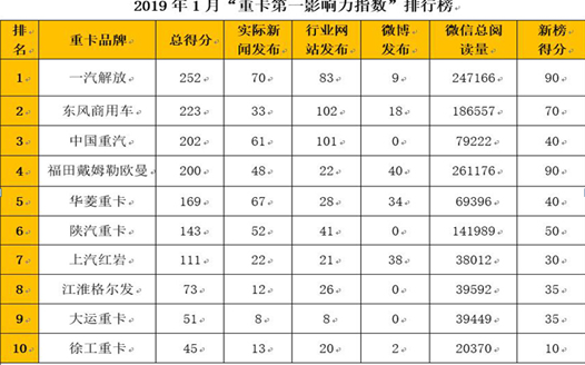 解放/東風(fēng)/福田誰(shuí)勝出?重卡第一影響力指數(shù)1月排行榜