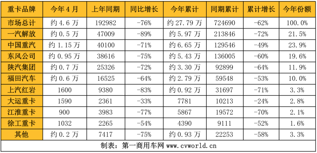 根據(jù)第一商用車(chē)網(wǎng)最新掌握的數(shù)據(jù),今年4月份,我國(guó)重卡市場(chǎng)大約銷(xiāo)售4.6萬(wàn)輛,環(huán)比今年3月份的7.7萬(wàn)輛下降40%,比上年同期的19.3萬(wàn)輛下降76%,凈減少近15萬(wàn)輛。4.6萬(wàn)輛,是自2007年以來(lái)4月份銷(xiāo)量的最低點(diǎn),僅高于2006年的3.35萬(wàn)輛。今年4月份也是重卡市場(chǎng)自去年5月份以來(lái)的連續(xù)第十二個(gè)月下降。