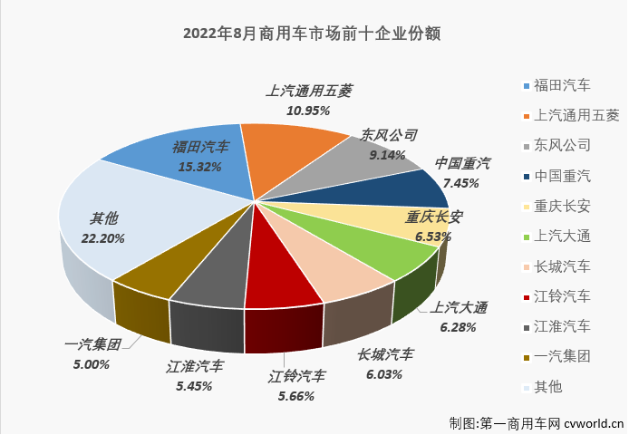 從市場份額來看,8月份銷量前十企業(yè)合計份額達到77.8%,排名前五的企業(yè)合計份額達到49.39%。8月份,商用車市場繼續(xù)僅有2家企業(yè)份額超過10%,福田和五菱分別分食了8月份商用車市場15.32%和10.95%的份額。