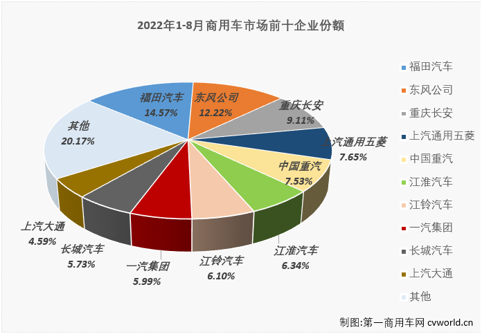 上表可見,2022年8月份,商用車市場同比增長4%,銷量增幅從上月(-21%)實現(xiàn)轉(zhuǎn)正。與前兩個月一樣,下滑并不是8月份商用車市場的唯一旋律,且8月份商用車市場實現(xiàn)增長的企業(yè)數(shù)首次超過了下滑的企業(yè)數(shù)。8月份商用車銷量排行前十企業(yè)6增4降:福田、五菱、大通、長城、江淮和一汽6家企業(yè)實現(xiàn)增長,8月份銷量同比分別增長了13%、123%、23%、41%、10%和8%;下滑的企業(yè)中有3家降幅仍達到兩位數(shù),下滑最嚴重的企業(yè)8月份銷量同比下降了30%。