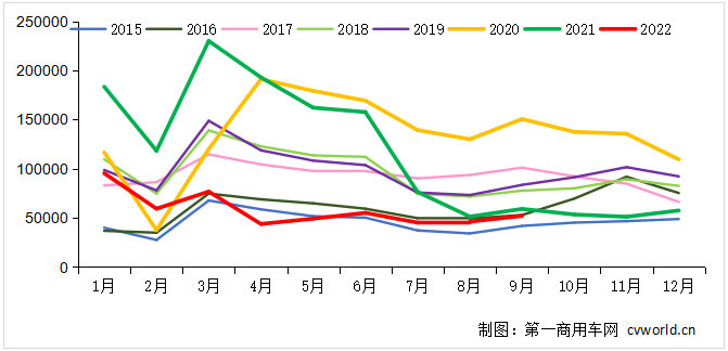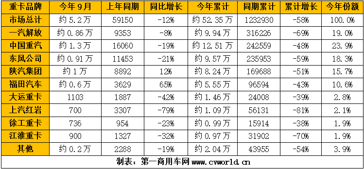 今年9月份,我國重卡市場約銷售5.2萬輛(開票口徑),環(huán)比今年8月上漲13%,比上年同期的5.92萬輛下降12%。5.2萬輛是自2016年以來9月份銷量的最低點,今年9月份也是重卡市場自去年5月份以來的連續(xù)第十七個月下降。