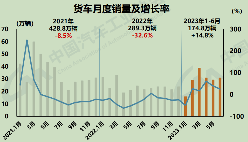 具體來看,6月,商用車中貨車產(chǎn)銷分別完成29.9萬輛和31萬輛,環(huán)比分別增長5%和5.4%,同比分別增長31%和25.8%。1-6月,貨車產(chǎn)銷分別完成174萬輛和174.8萬輛,同比分別增長15.5%和14.8%。