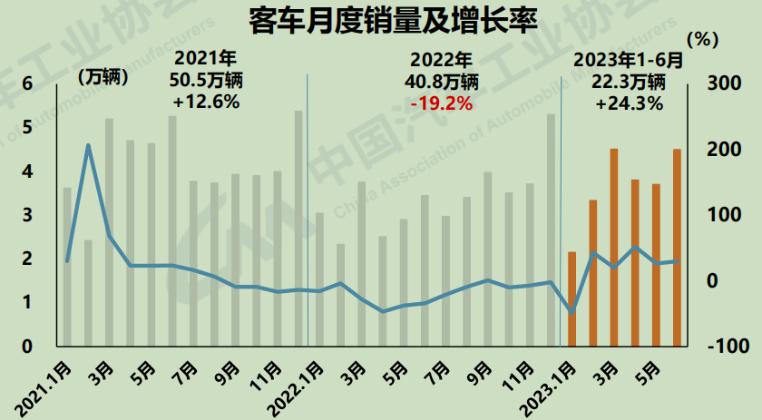 6月,客車產(chǎn)銷分別完成4.3萬輛和4.5萬輛,環(huán)比分別增長16.4%和22%,同比分別增長32.8%和29.9%。1-6月,客車產(chǎn)銷分別完成22.7萬輛和22.3萬輛,同比分別增長28.9%和24.3%。
