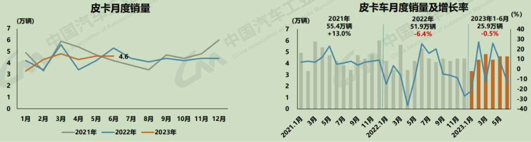 1-6月,皮卡產(chǎn)銷分別完成25.3萬輛和25.9萬輛,同比分別下降4.7%和0.5%,分燃料情況看,汽油皮卡車產(chǎn)銷分別完成7萬輛和7.1萬輛,同比分別增長26.7%和33.7%;柴油皮卡車產(chǎn)銷分別完成17.7萬輛和18.3萬輛,同比分別下降15.4%和11.7%。