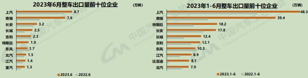 6月,在整車出口的前十位企業(yè)中,上汽出口量達(dá)8.7萬輛,同比增長15.1%,占總出口量的22.7%。1-6月,整車出口前十企業(yè)中,從增速上來看,比亞迪出口8.1萬輛,同比增長10.6倍;奇瑞出口39.4萬輛,同比增長1.7倍;長城出口12.4萬輛,同比增長97.3%。