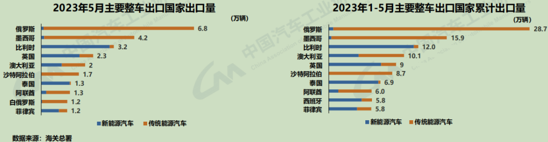 1-5月,汽車出口193.3萬輛,同比增長79.8%。其中新能源汽車出口67.3萬輛,同比增長1.2倍。汽車出口量前十的國家中,俄羅斯、墨西哥和比利時(shí)出口量位居前三,市場表現(xiàn)較強(qiáng)。新能源汽車出口的前三大國家為比利時(shí)、英國和泰國。