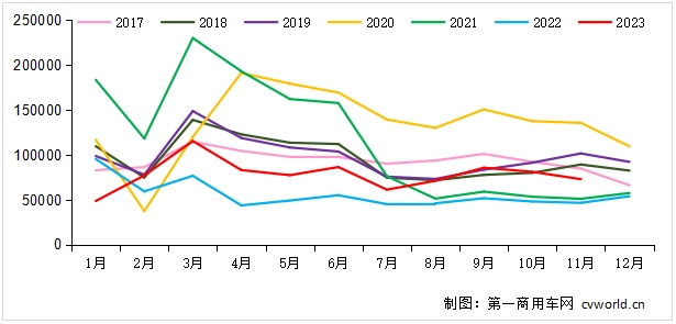 11月份7.3萬輛這個銷量水平,放在最近七年里來看,高于2021-2022年同期;從今年的月度情況來看,11月份的重卡銷量還未達到1-10月的月均銷量水平(7.9萬輛),低于今年2月份和5月份。