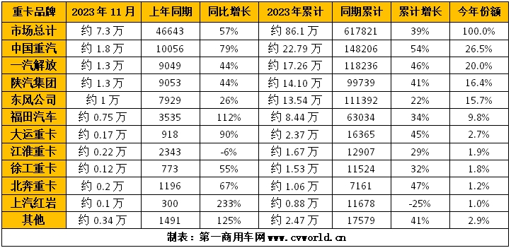 11月重卡銷7.3萬輛!重汽1.8萬,解放增4成,福田/紅巖/大運翻倍